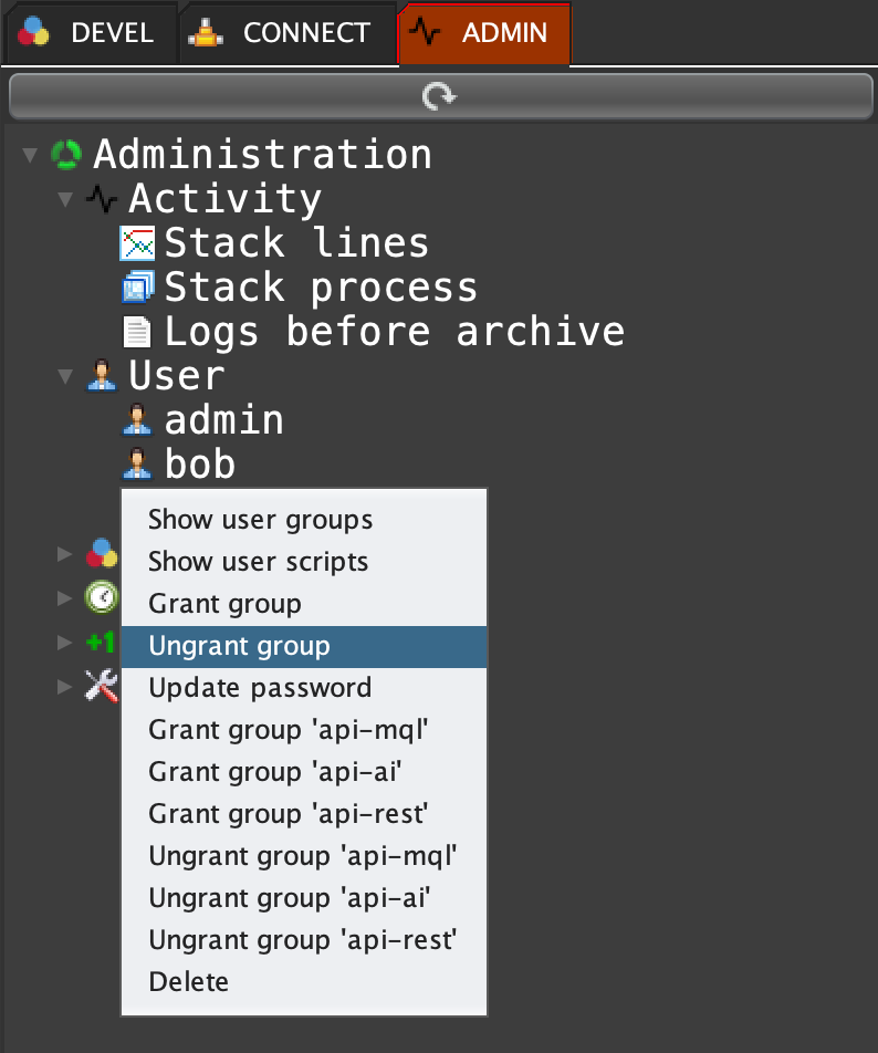 Click on the ADMIN tab, open 'User', right click on 'bob' and select 'Ungrant group' ...