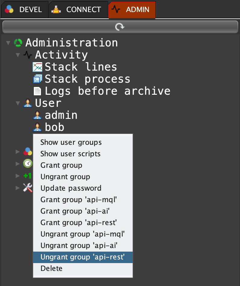 Click on the ADMIN tab, open 'User', right click on 'bob' and select 'Ungrant group api-rest' ...