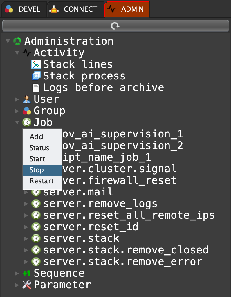 Click on 'ADMIN' tab, right click on 'Job' and select 'Stop'