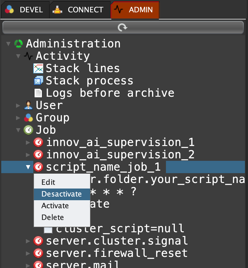 Click on 'ADMIN' tab, open 'Job', right click on the job key 'script_name_job_1' and select 'Desactivate'
