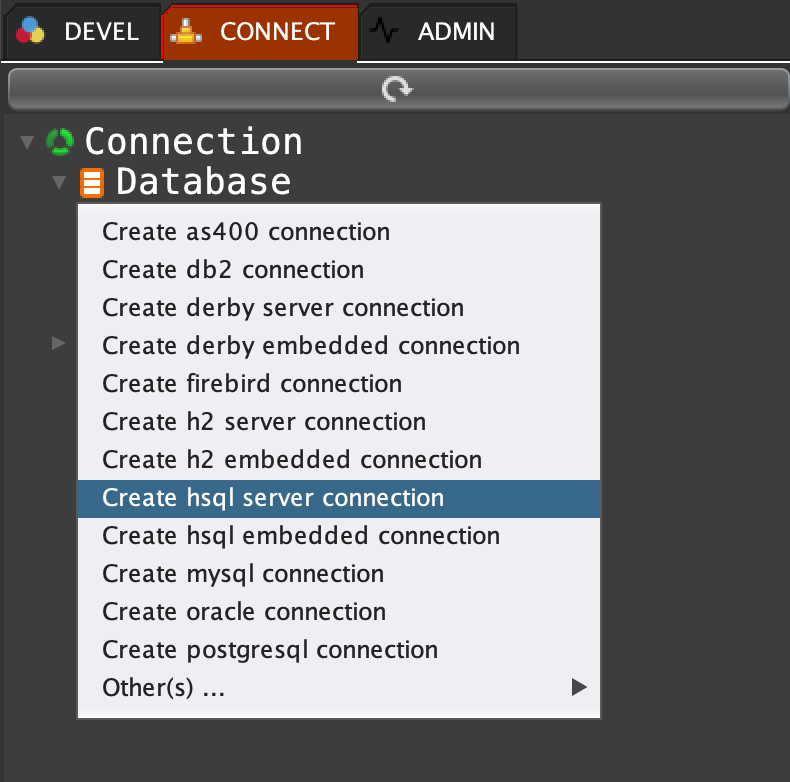 Click on 'CONNECT' tab, right click on 'Database' and select 'Create hsql server connection'