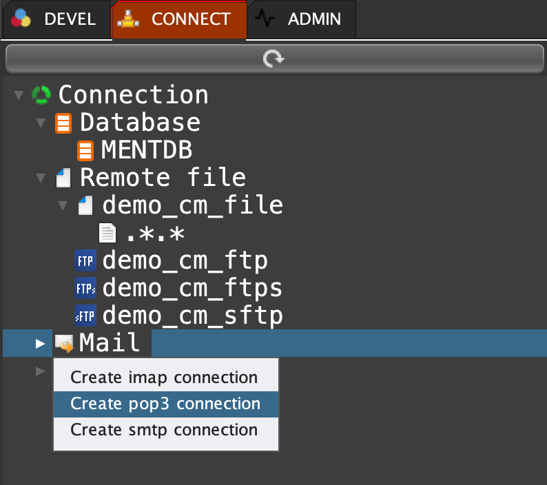 Click on 'CONNECT' tab, right click on 'Mail' and select 'Create pop3 connection'