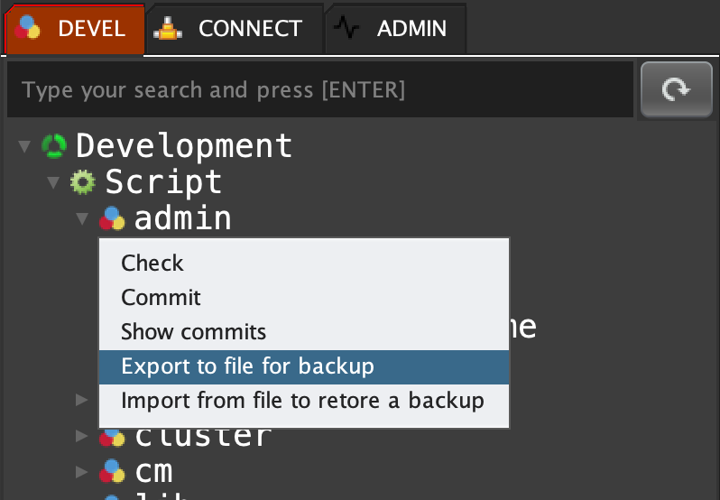 Click on 'DEVEL' tab, open 'Script', right click on 'admin' and select 'Export to file for backup'