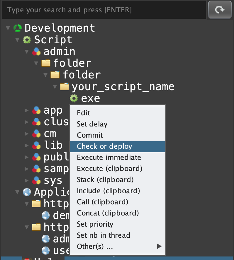 concat "demo_cm_mentdb:" [_n_] (execute "src.tools.deploy.exe" "[startsWith]" "folder.folder.your_script_name.exe" "[mentdbCmId]" "demo_cm_mentdb" "[groups]" "admin" "[check]" "1" ) " ################################################ "