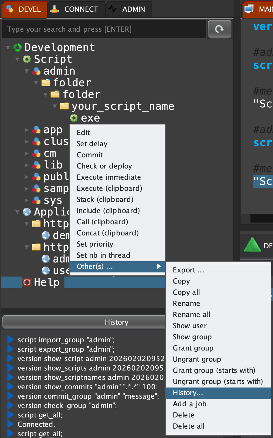 Click on 'DEVEL' tab, open 'Script', open 'admin', right click on 'folder.folder.your_script_name.exe' and select 'History...'