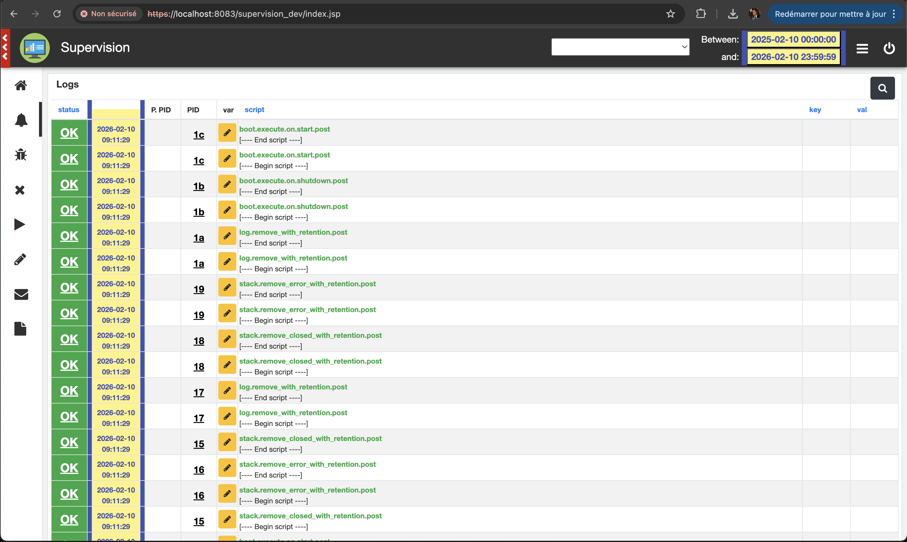 Connect to the application: https://localhost:8083/supervision_dev, and open the log page (menu on the left)