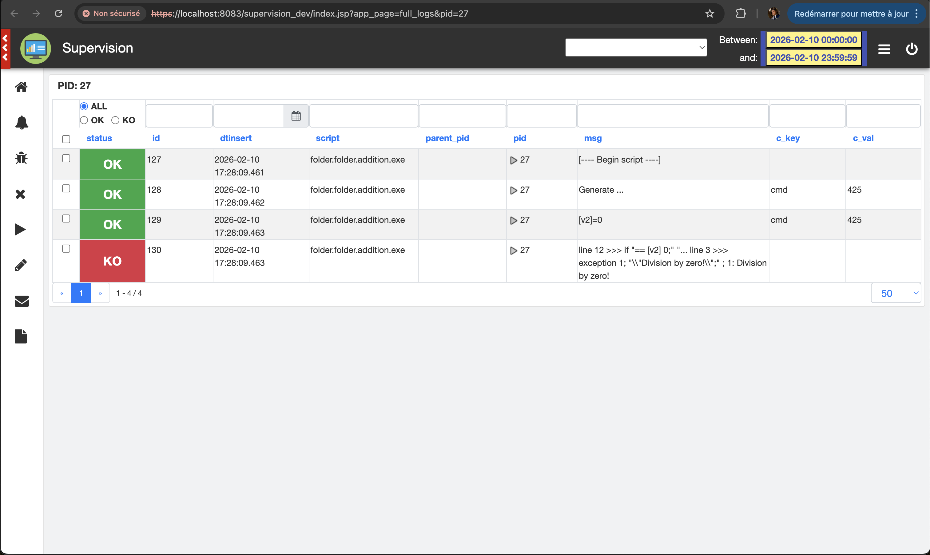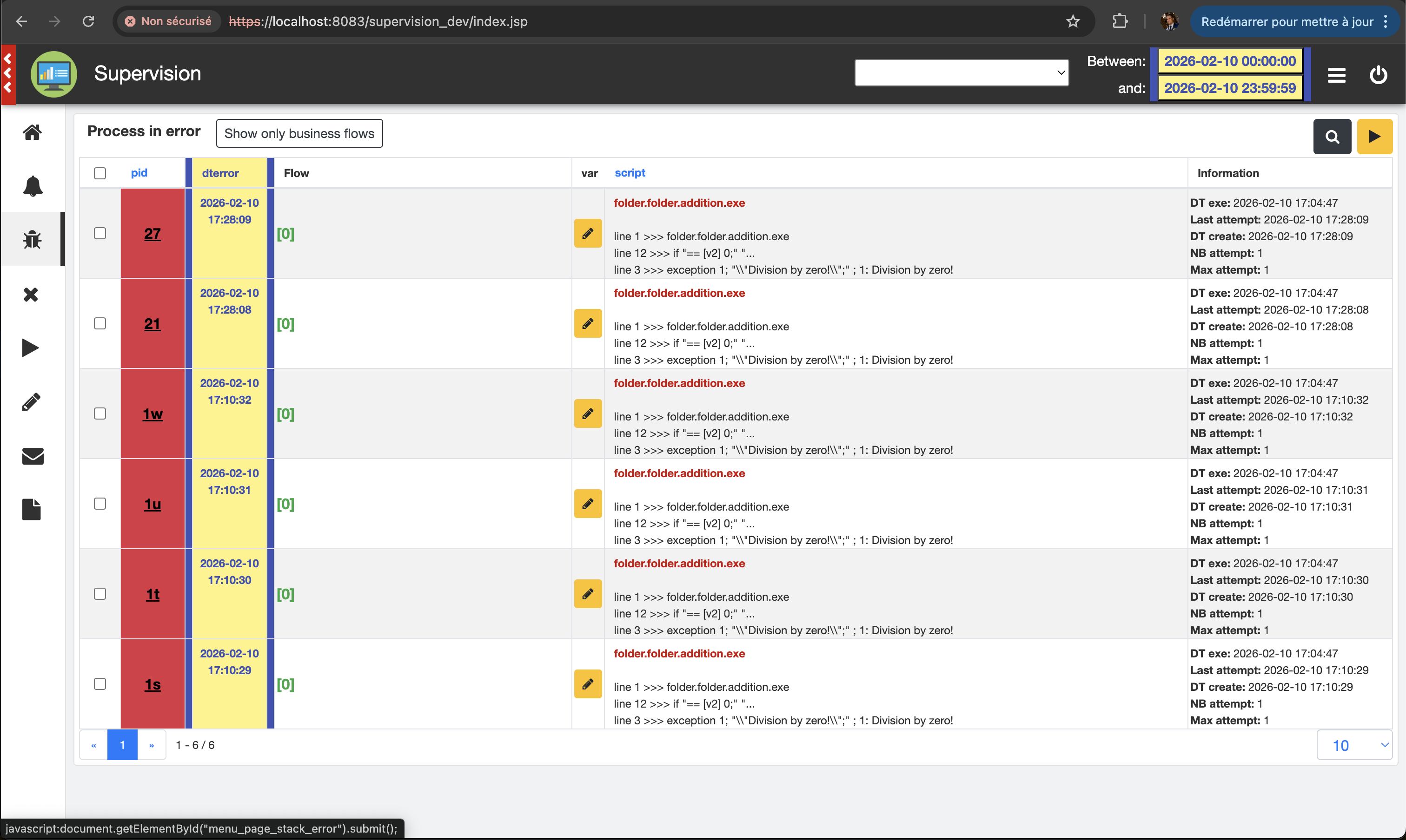Connect to the application: https://localhost:8083/supervision_dev, and open the process in error page (menu on the left)