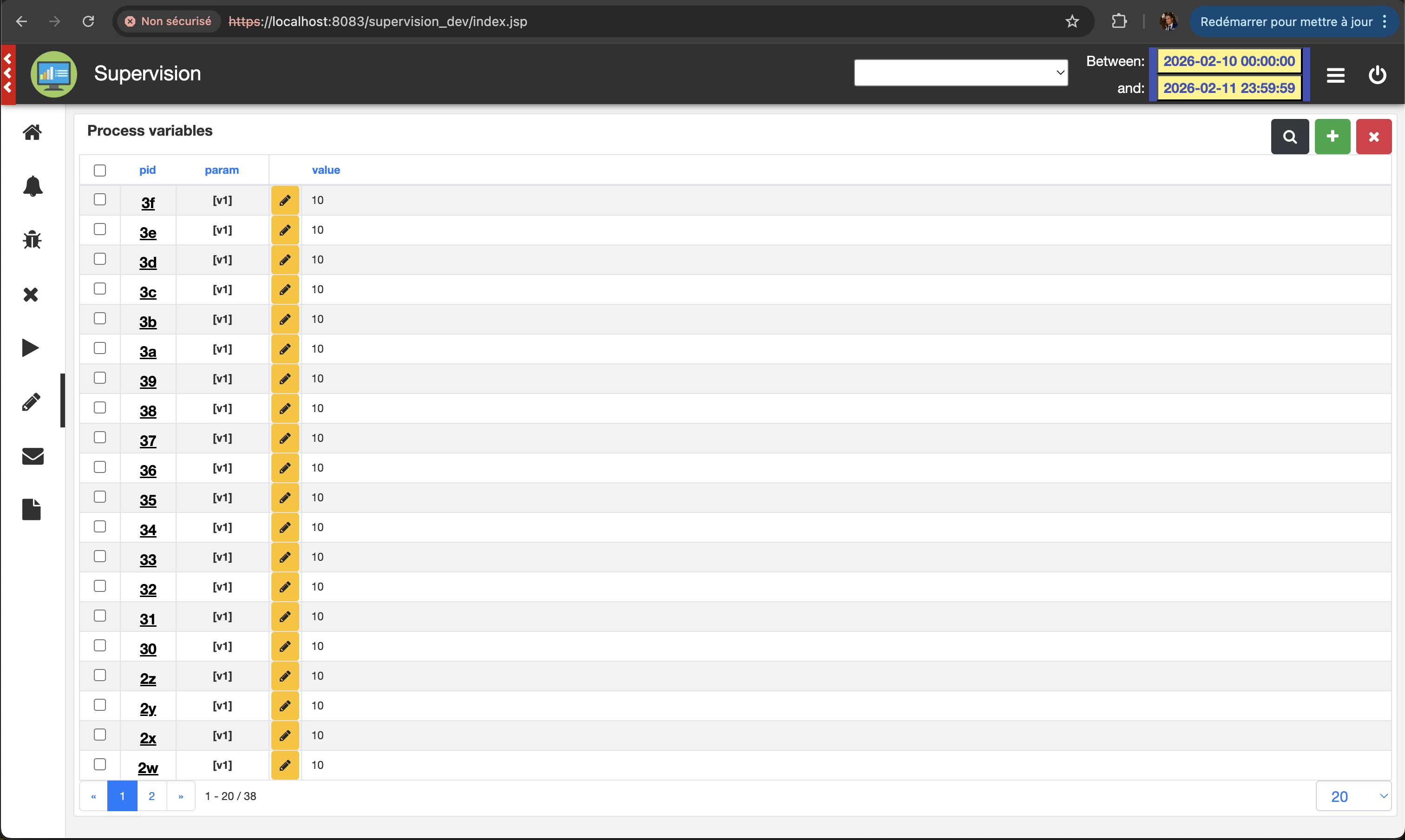 Connect to the application: https://localhost:8083/supervision_dev, and open the parameter process page (menu on the left)
