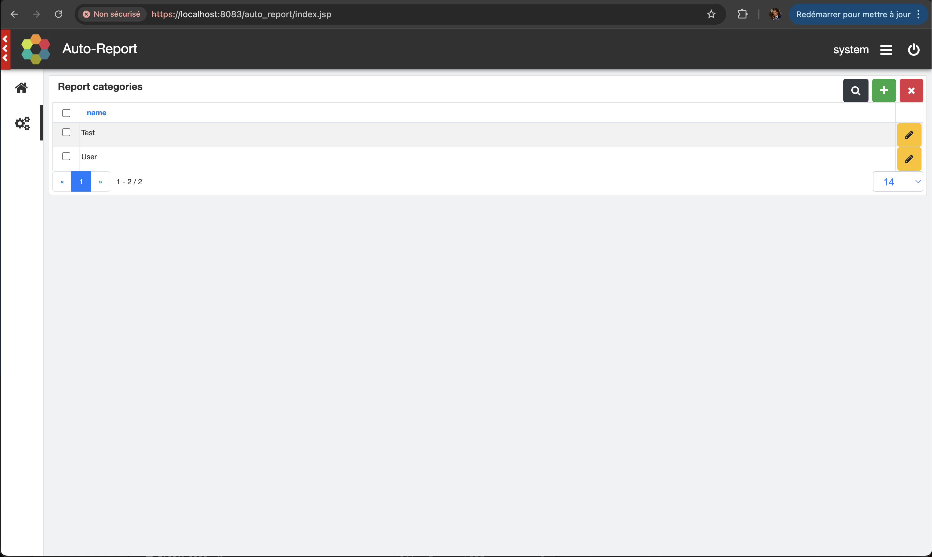 Connect to the application: https://localhost:8083/auto_report, and open the category page (menu on the left)