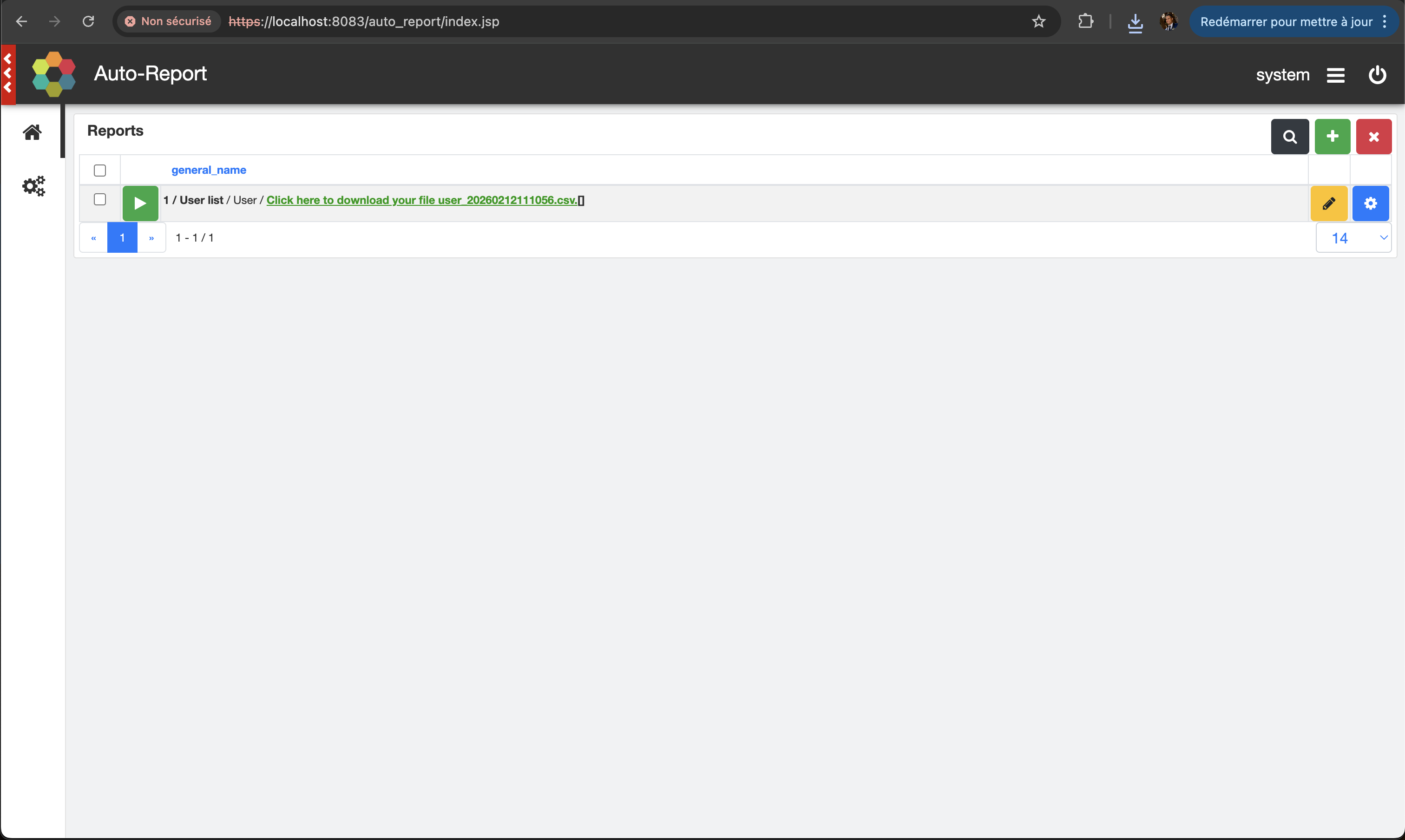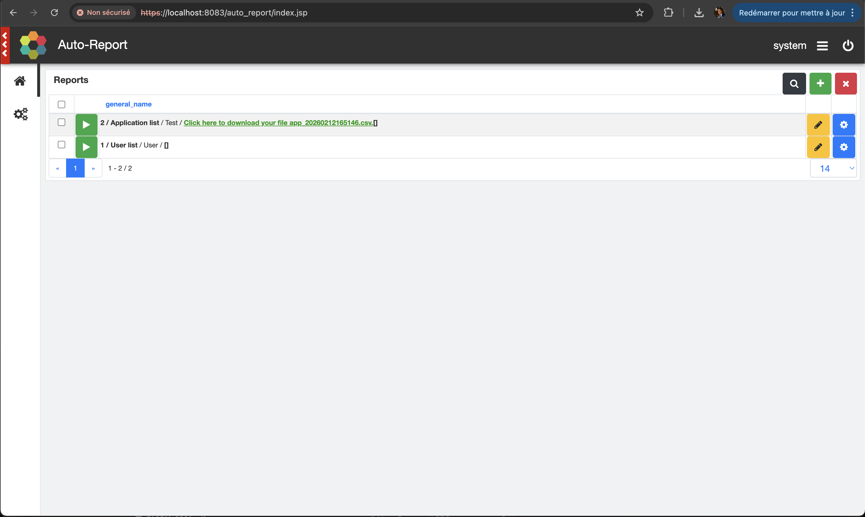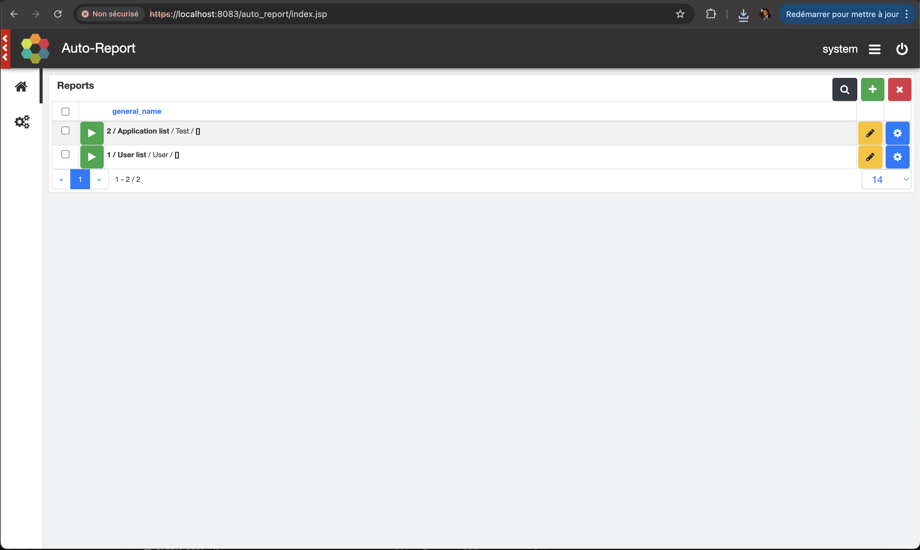 Connect to the application: https://localhost:8083/auto_report, you are on the home page.