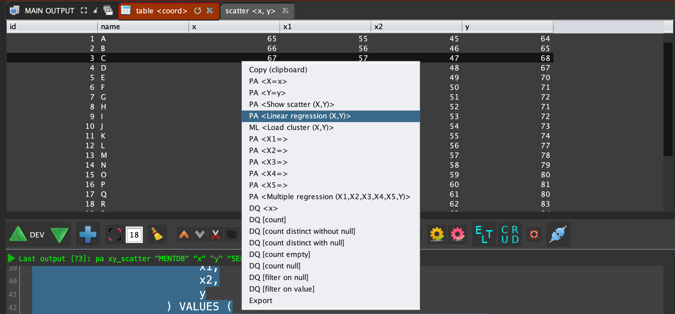 pa rl load "reg1" "MENTDB" "x" "y" "SELECT * FROM public.coord LIMIT 0, 500"; pa rl predict "reg1" 12;