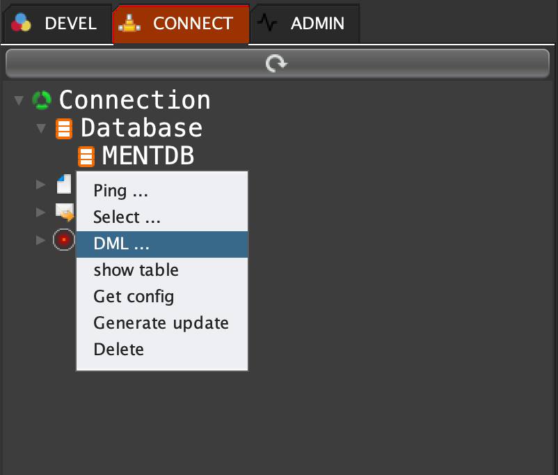 Click on 'CONNECT' tab, open 'Database', right click on 'MENTDB' and select 'DML ...'