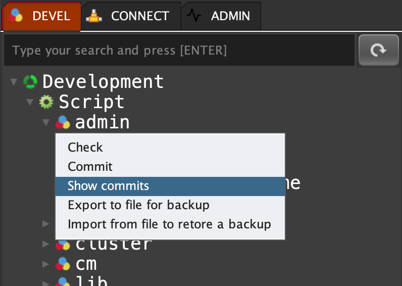 Click on 'DEVEL' tab, open 'Script', right click on 'admin' and select 'Show commits'