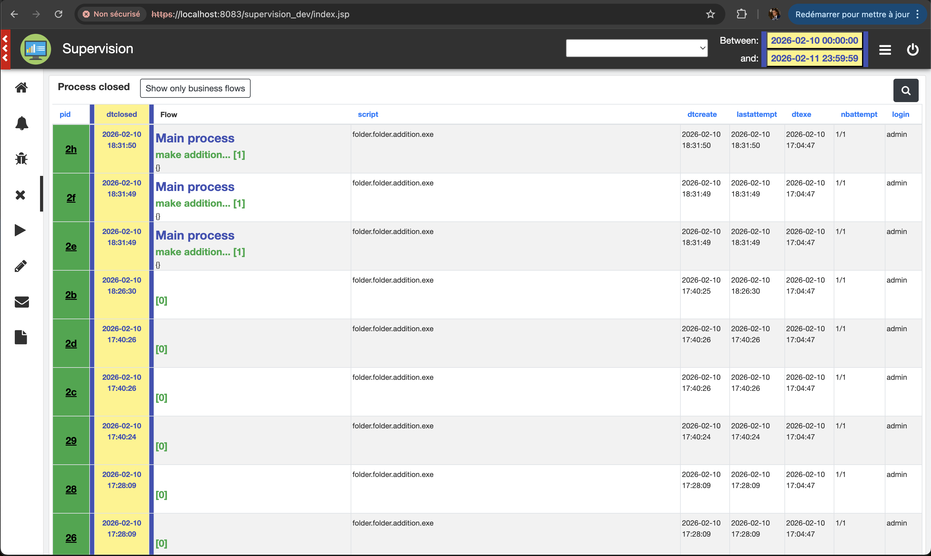 Connect to the application: https://localhost:8083/supervision_dev, and open the process closed page (menu on the left)
