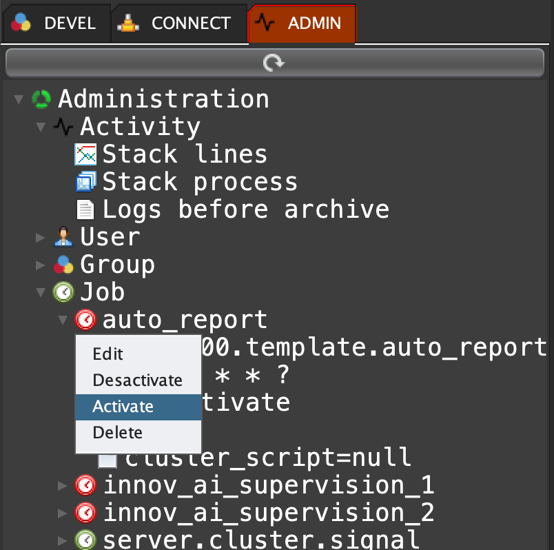Click on ADMIN tab, open 'Job', right click on 'auto_report' and select 'Activate'